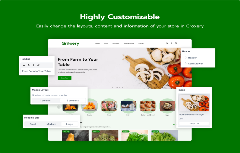The Groxery theme's architecture is built on Shopify's latest best practices, ensuring a smooth, fast, and secure online shopping experience. Grocery offers extensive support and customization options. Whether you're setting up a new store or revamping an existing one, our team is just a click away to assist you.